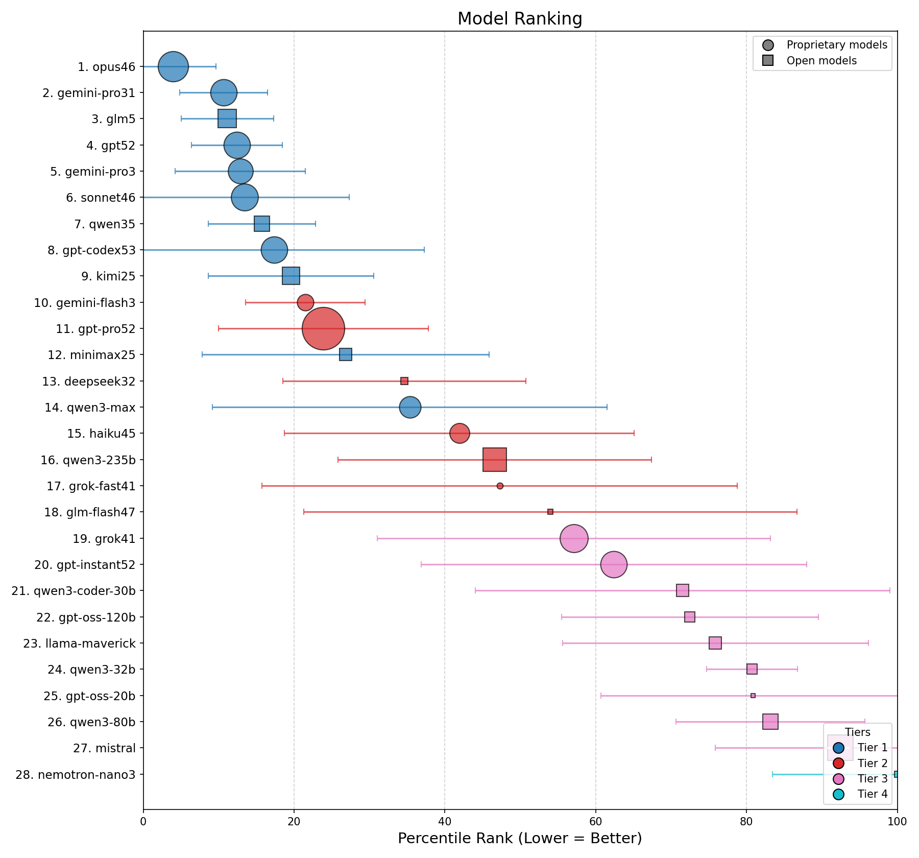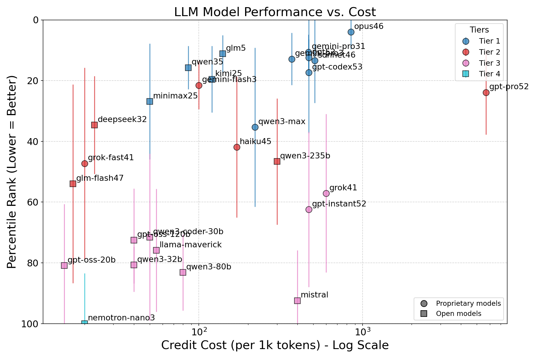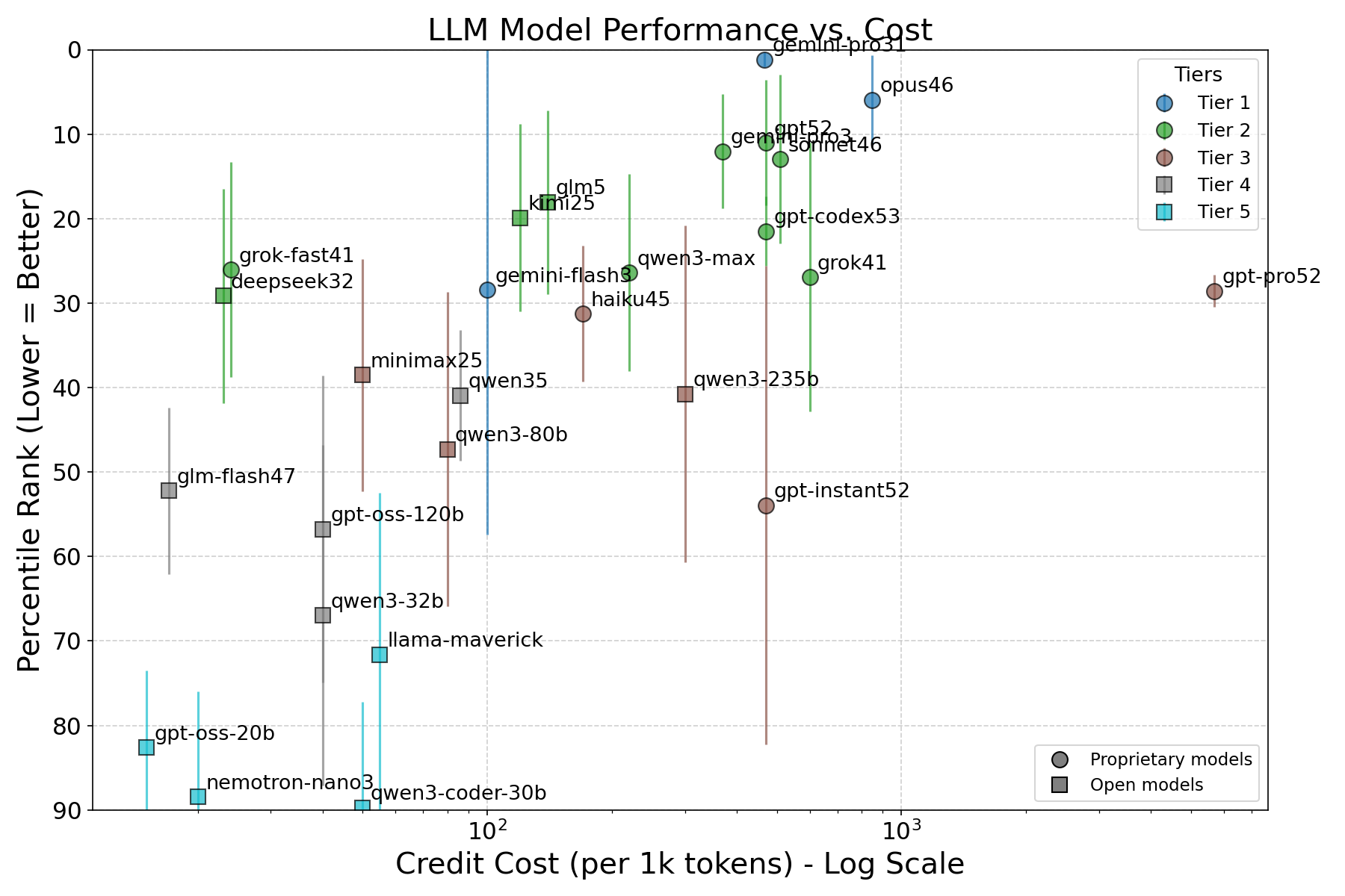 Figure 1. Left panel: Overall ranking. Circle size proportional to log10(API cost). Right panel: Credit cost (log scale) on the x-axis and average percentile score on the y-axis (inverted, so the best models appear at the top). The upper-left corner is the sweet spot: best performance at lowest cost. In both panels, error bars show ±1σ. Colors indicate statistical tier. Circles mark proprietary models; squares mark open-weights models.